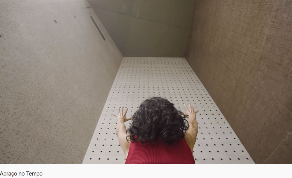 Performance de bailarina em Abraço no Tempo/ Print de tela, 29'Dou outro break pra dentro de mim e penso nos homens e mulheres que galopam as máquinas estridentes lá fora. Nenhum deles está ouvindo Beethoven. Nenhum deles está tocando violino na orquestra Castro Alves. Nenhum deles ouve Caetano agora. Mas injetam na cidade a velocidade, o ruído, a descontinuidade de existir, o som do conflito — a unha do real arranhando a lousa do sonho. Ajustam o capacete nesta noite distópica enquanto o violoncelista apruma o arco para reviver a sinfonia germânica. Heróis, ambos, a seu modo, cavalgam como podem nesse tempo desfavorável.