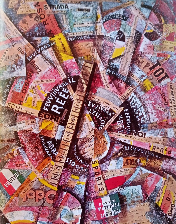 Carlo Carrà (1881) - Manifestação Intervencionista (Colagem sobre cartão) - Coleção Gianni Mattioli E quando o cronista as espicaça, viram gatos. Esticam-se, espreguiçam-se, rodam sobre si, amassam pãozinho e voltam a deitar-se. O cronista ilude-se, pois as vê atarem-se em orações, enganchar-se em vírgulas, conjunções e preposições. Mas logo enrodilham-se em si mesmas, enrolando-se, enrolando-o.