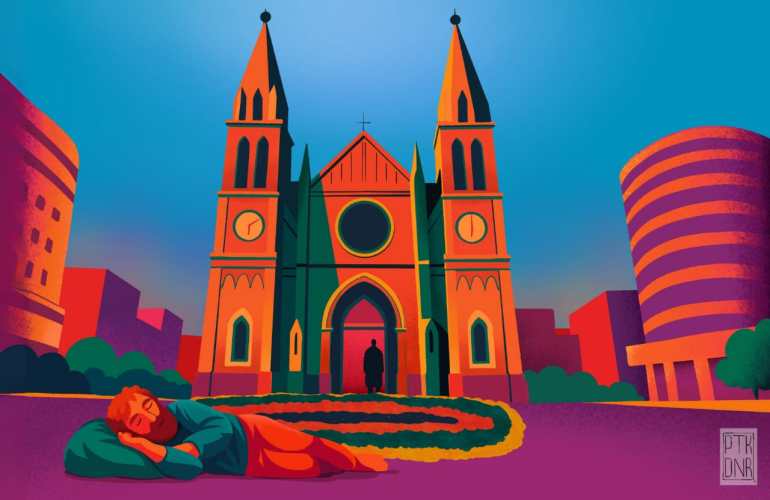 O padre octogenário lê o Evangelho de João feito uma criança de nove anos. A catedral de Curitiba parece um salão de baile da terceira idade. A missa do meio-dia avança embrulhada numa quarta-feira gelada. Dois idosos surgem entre os bancos da assistência cada um empunhando uma salva, algo entre um enorme coador de café…